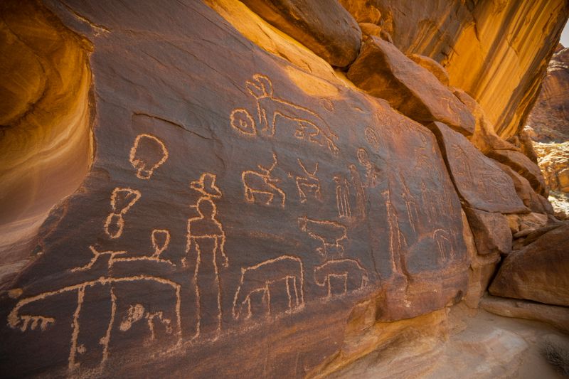 Por otra parte de las representaciones de animales, las paredes rocosas además muestran escenas de caza, danzas rituales y la ordenamiento social de los pueblos antiguos. Palmeras, armas y figuras humanas en movimiento aparecen yuxtapuesto a inscripciones tamúdicas, lo que ilustra aún más el rico tapiz cultural de la zona. Estas antiguas tallas sirven como un registro del mundo natural y una expresión de la dinámica espiritual y social que alguna vez definió la vida en la región.