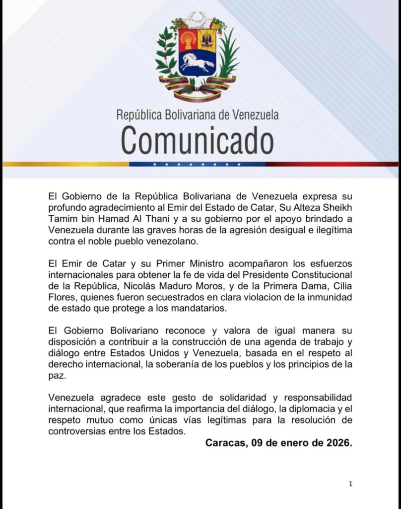 Según un comunicado oficial difundido a través de la cuenta de Telegram del Ministro de Relaciones Exteriores Yvan Gil, el Emir de Qatar y su Primer Ministro apoyaron los esfuerzos internacionales para certificar la “prueba de vida” del Presidente constitucional Nicolás Reflexivo Moros y la Primera Dama, Cilia Flores, luego de que fueron presuntamente “secuestrados en clara violación de la inmunidad estatal que protege a los jefes de Estado”.